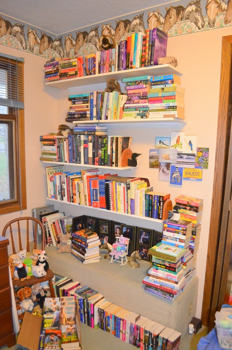 I have four bookcases sitting in my office. Hubby built an extra shelf going across the top of the closet where we also have books and a wire hanging shelf on the inside of the closet filled with paperbacks. Hubby seems to think he needs two of the bookshelves for his health and wellness, computer manuals and stock magazines. He doesn't read fiction, but he devours non-fiction. My two bookshelves in the office are filled with my books and research books. Since we're planning on moving in two years I've stared to let go of my paperbacks and replace them with ebooks. But its hard...